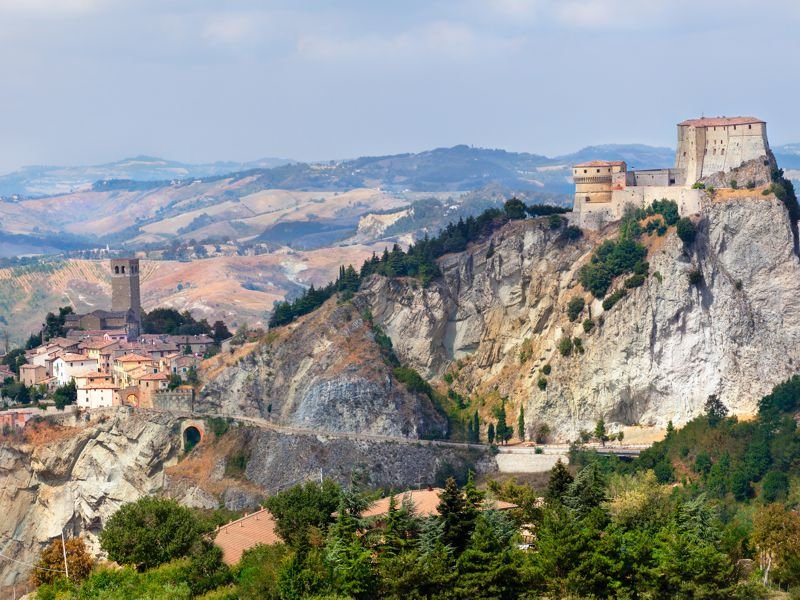 Nur etwa 30 ins Landesinnere von Rimini entfernt liegt die mittelalterliche Stadt San Leo. Schon die Lage ist spektakulär: Auf einem steilen Felsen thront die Festung von San Leo und bietet einen weiten Blick über die sanfte Hügellandschaft bis hin zur Adria.