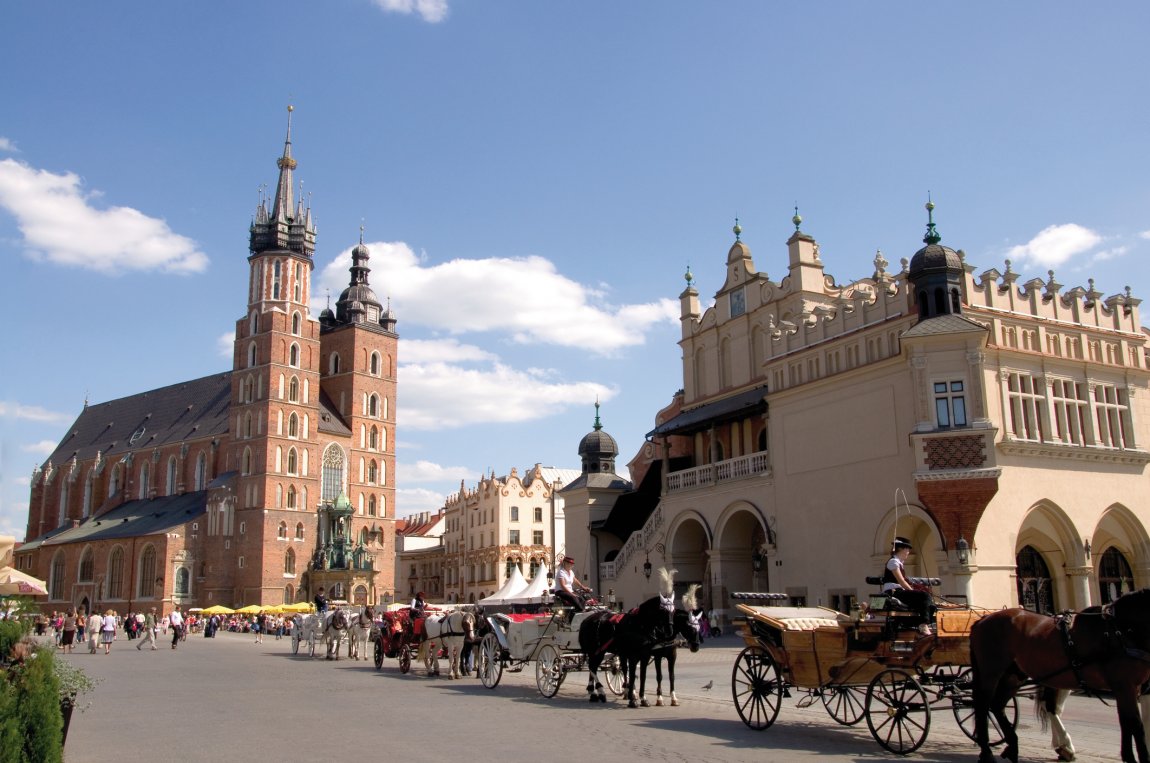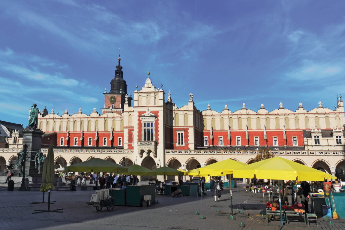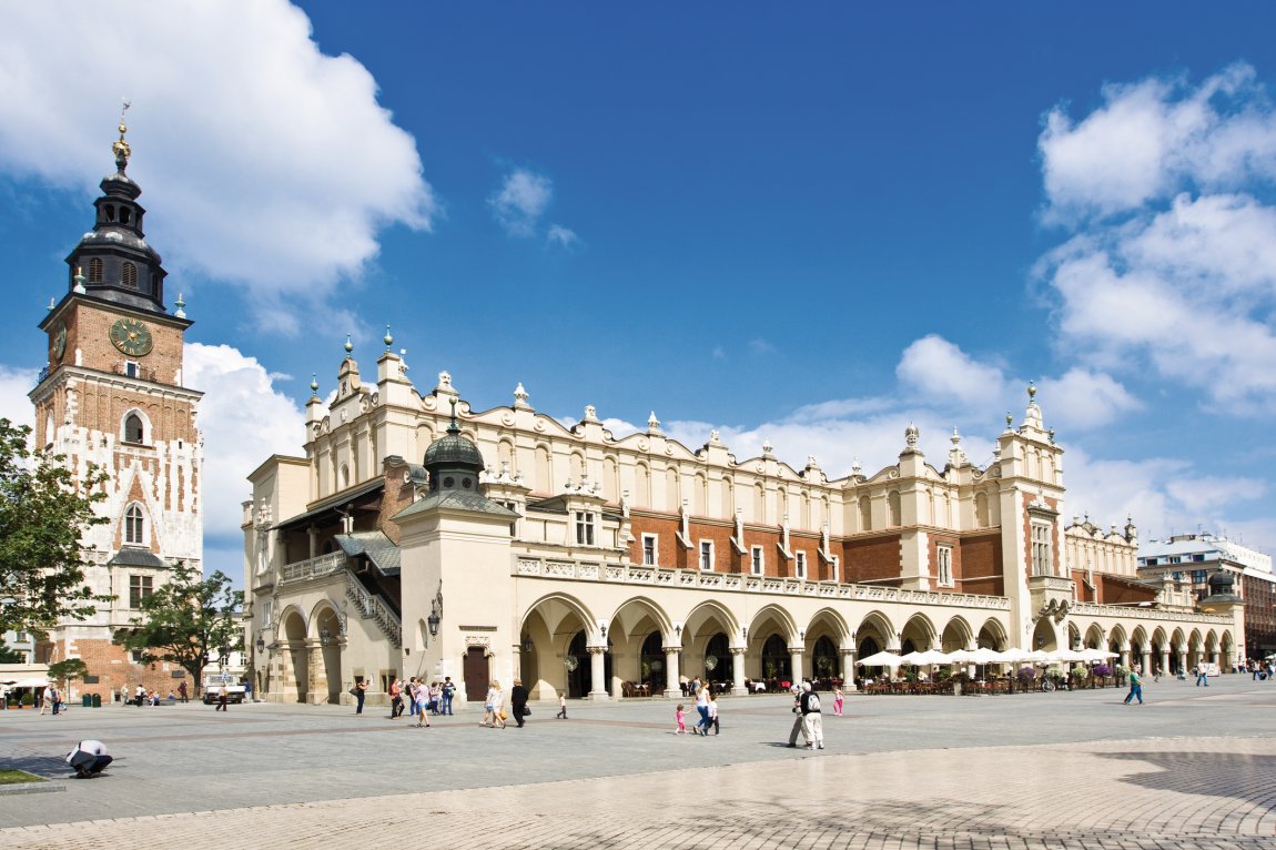Die Krakauer Altstadt gehört seit 1978 zum UNESCO-Weltkulturerbe und ist ein lebendiges Museum mittelalterlicher Architektur. Der Hauptmarkt (Rynek Główny) ist einer der größten mittelalterlichen Marktplätze Europas. Die berühmten Tuchhallen im Zentrum des Platzes zeigen eindrucksvoll italienische Baukunst mitten in Polen – bereits im 14. Jahrhundert wurden diese Handelshallen errichtet, und noch heute kann man durch die Arkadengänge flanieren und das besondere Flair genießen.